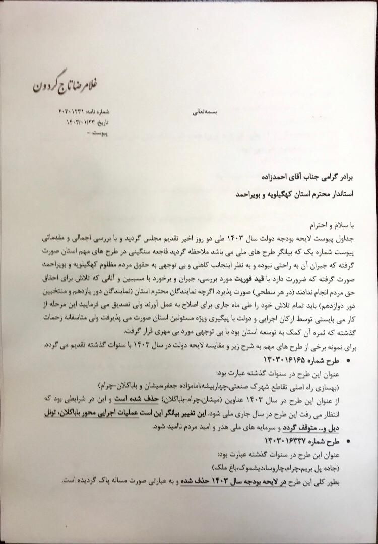 جداول پیوست لایحه بودجه دولت سال ١٤٠٣ طی دو روز اخیر تقدیم مجلس گردید و با بررسی اجمالی و مقدماتی پیوست شماره یک که بیانگر طرحهای ملی میباشد، ملاحظه گردید فاجعه سنگینی در طرحهای مهم استان صورت گرفته که جبران آن به راحتی نبوده و بنظر اینجانب کاهلی، بی توجهی به حقوق مردم مظلوم کهگیلویه و بویراحمد صورت گرفته که ضرورت دارد با قید فوریت مورد بررسی، جبران و برخورد با مسببین و آنانی که تلاش برای احقاق حق مردم انجام ندادند (در هر سطحی) صورت پذیرد.