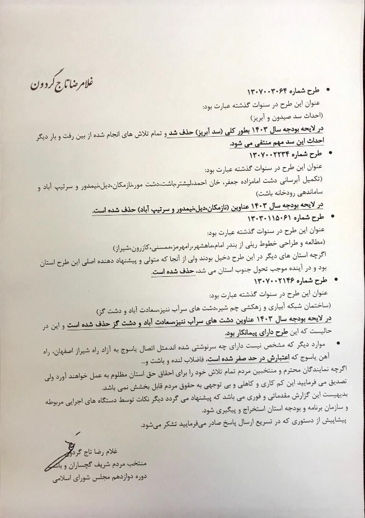 غلامرضا تاجگردون منتخب مردم شریف گچساران و باشت طی نامه ای خطاب به استاندار تاکید کرد که در بودجه سال جاری، فاجعه سنگینی در طرحهای مهم استان صورت گرفته و می بایست با قید فوریت این مهم بررسی و جبران گردد.