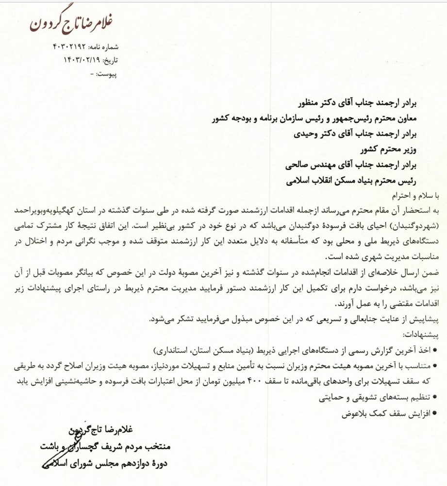به استحضار آن مقام محترم ميرساند ازجمله اقدامات ارزشمند صورت گرفته شده در طي سنوات گذشته در استان كهگيلويهوبويراحمد (شهردوگنبدان) احيای بافت فرسودۀ دوگنبدان ميباشد كه در نوع خود در كشور بينظير است. اين اتفاق نتيجۀ كار مشترك تمامي دستگاههاي ذيربط ملي و محلي بود كه متأسفانه به دلايل متعدد اين كار ارزشمند متوقف شده و موجب نگراني مردم و اختلال در مناسبات مديريت شهري شده است.