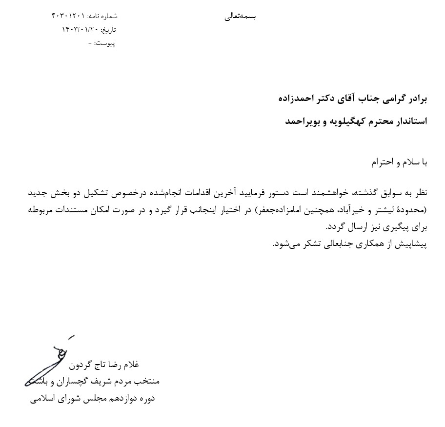 با سلام و احترام نظر به سوابق گذشته، خواهشمند است دستور فرماييد آخرين اقدامات انجامشده درخصوص تشكيل دو بخش جديد (محدودۀ ليشتر و خيرآباد، همچنين امامزادهجعفر) در اختيار اينجانب قرار گيرد و در صورت امكان مستندات مربوطه براي پيگيري نيز ارسال گردد.