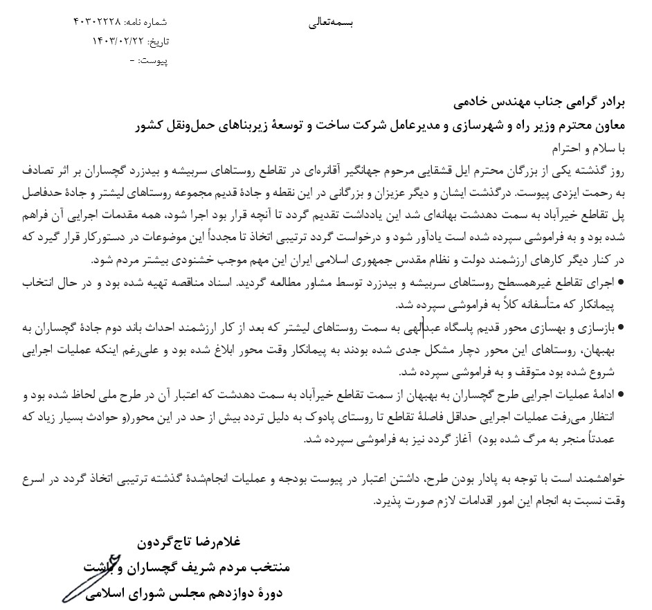 روز گذشته يكي از بزرگان محترم ايل قشقايي مرحوم جهانگير آقانرهاي در تقاطع روستاهاي سربيشه و بيدزرد گچساران بر اثر تصادف به رحمت ايزدي پيوست. درگذشت ايشان و ديگر عزيزان و بزرگاني در اين نقطه و جادۀ قديم مجموعه روستاهاي ليشتر و جادۀ حدفاصل پل تقاطع خيرآباد به سمت دهدشت بهانهاي شد اين يادداشت تقديم گردد تا آنچه قرار بود اجرا شود، همه مقدمات اجرايي آن فراهم شده بود و به فراموشي سپرده شده است يادآور شود و درخواست گردد ترتيبي اتخاذ تا مجدداً اين موضوعات در دستوركار قرار گيرد که در كنار ديگر كارهاي ارزشمند دولت و نظام مقدس جمهوري اسلامي ايران اين مهم موجب خشنودي بيشتر مردم شود.