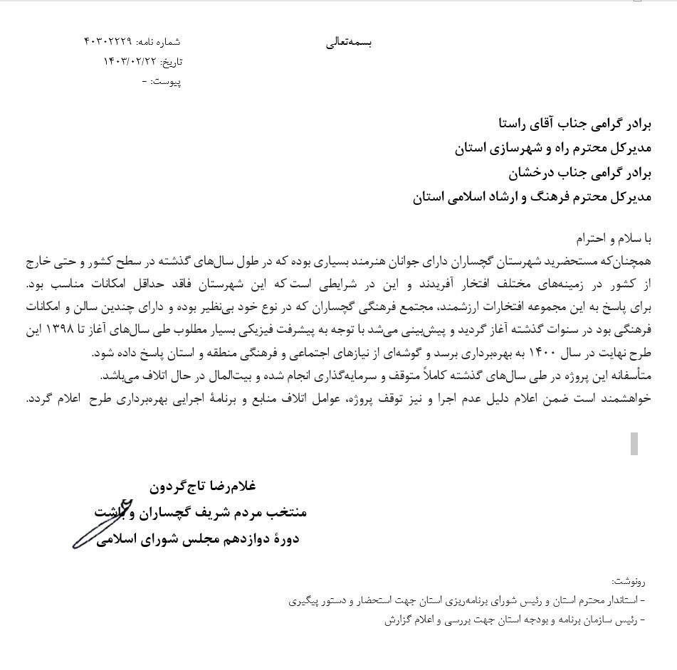 پیگیری اتمام مجتمع بزرگ فرهنگی-هنری گچساران